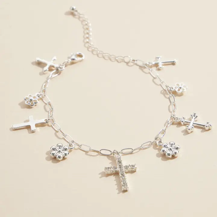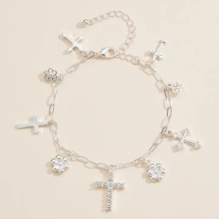 Silver Charm Bracelet with Different Style Cross and Floral Pendants – Fashion Jewelry Add timeless elegance to your accessory collection with this stunning charm bracelet, available in gold-tone and silver-tone finishes. Featuring a delicate chain-link design, it is adorned with alternating cross pendants and floral charms for a meaningful yet chic look. This versatile bracelet makes the perfect statement piece for casual outfits, evening wear, or special occasions.