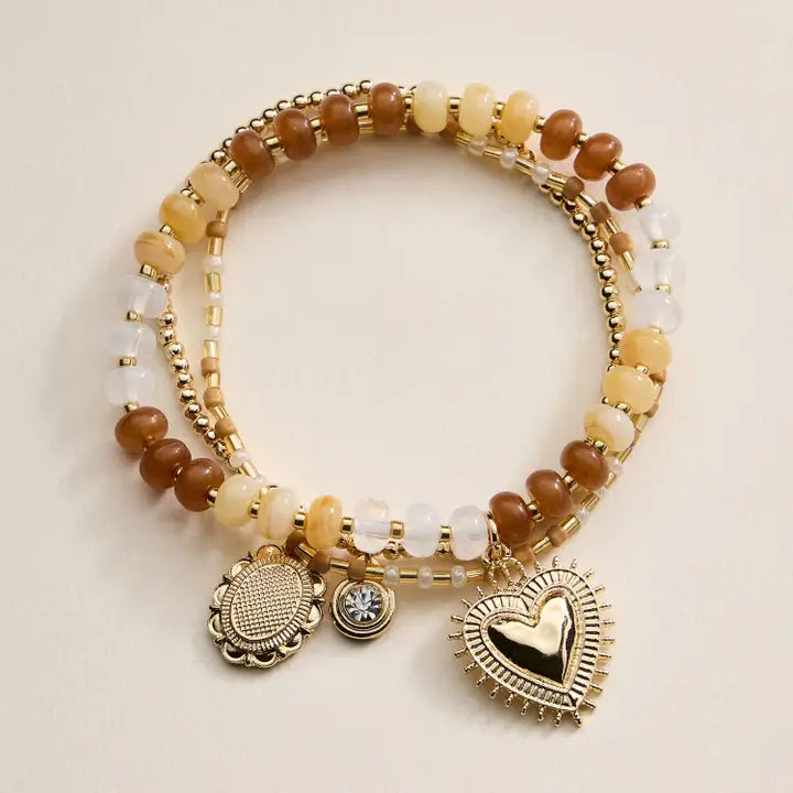 Beaded Heart Charm Stretch Bracelet Set Natural
