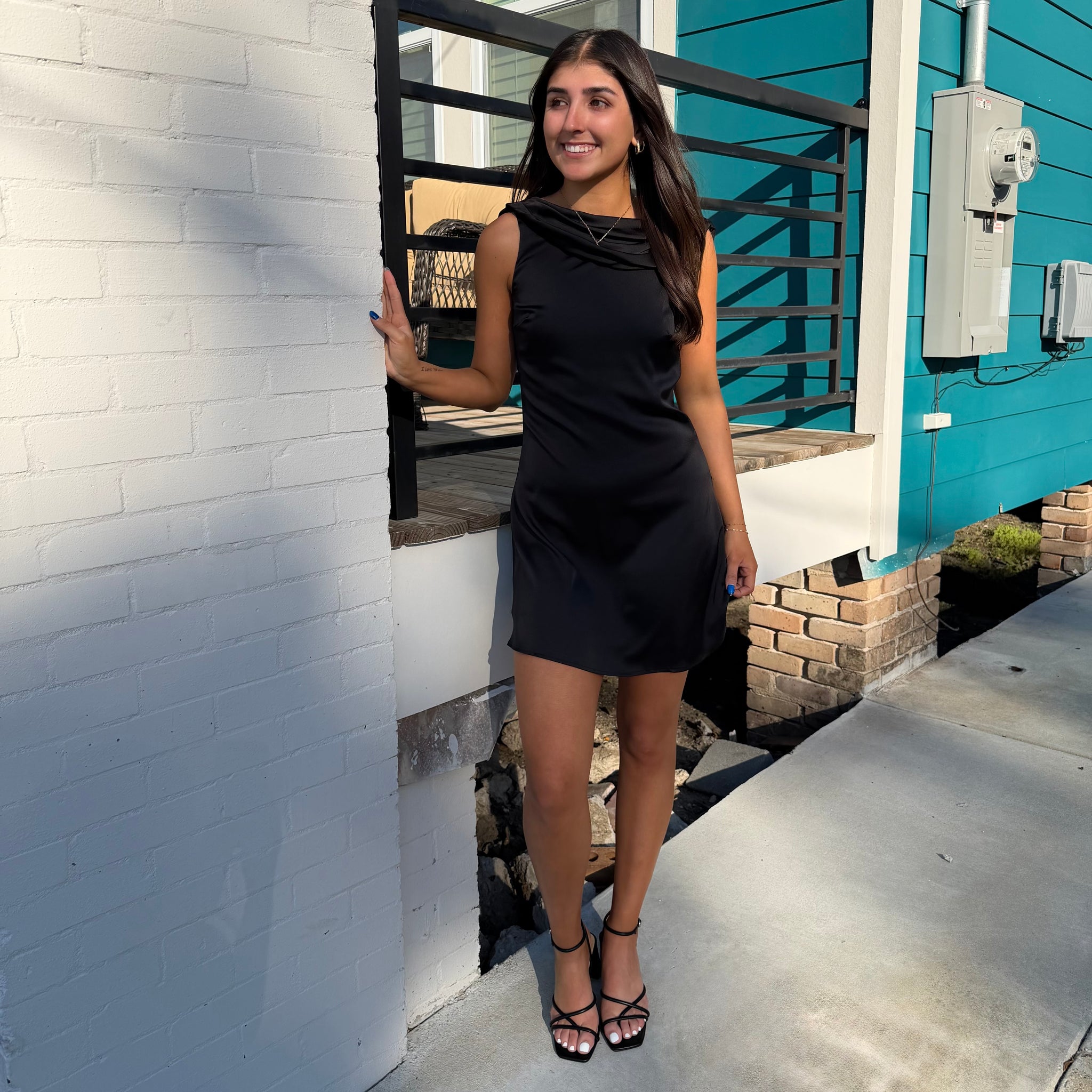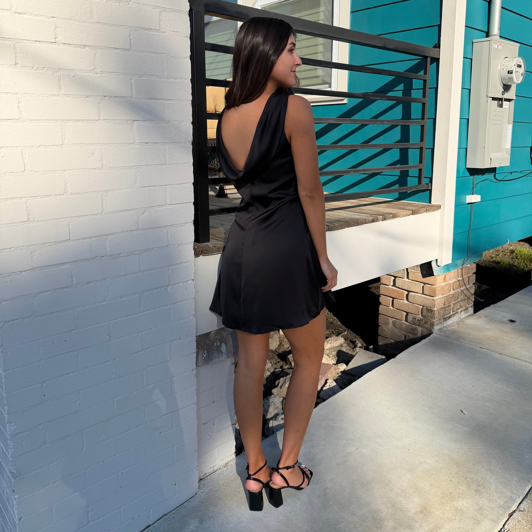Elevate your evening with this stunning Cocktail Hour Mini Dress, featuring a gracefully draped cowl neckline that flatters every frame. The daring open back design adds an unexpected touch of allure, making it perfect for date nights, celebrations, or whenever you want to turn heads. This piece effortlessly transitions from cocktail bars to upscale venues, offering sophisticated style with a hint of bold confidence. The mini silhouette keeps things modern and playful while the refined draping ensures you'll feel polished and put-together. Whether you're dressing up for a special occasion or making a statement at your next night out, this dress delivers the perfect balance of elegance and edge.