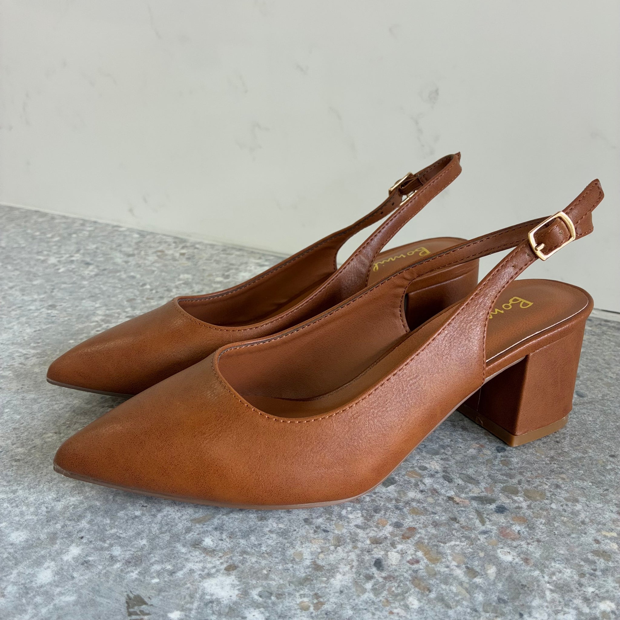 Step out with confidence in the Brown More Heel, featuring elegant pointed toes and chic sling-back straps. These kitten block heels offer just the right lift for all-day comfort while enhancing your silhouette. Perfect for both professional settings and stylish evenings, they combine sophistication with ease, making them a must-have addition to your wardrobe.