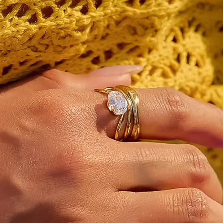 Elevate your style with the Gloire Ring, featuring an abstract design set with sparkling cubic zirconia and crafted from 18K gold that resists tarnishing. This unique piece adds a modern, radiant touch to any ensemble, combining artistic elegance with lasting brilliance for a truly standout accessory.