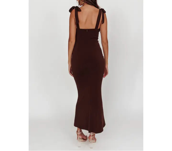 The Rylee Maxi Dress combines sleek bodycon style with delicate tied straps for a flattering, adjustable fit. This dress hugs your curves while offering a sophisticated silhouette, making it perfect for evenings out or special occasions. Elevate your look with a comfortable yet stunning design that enhances your natural elegance.