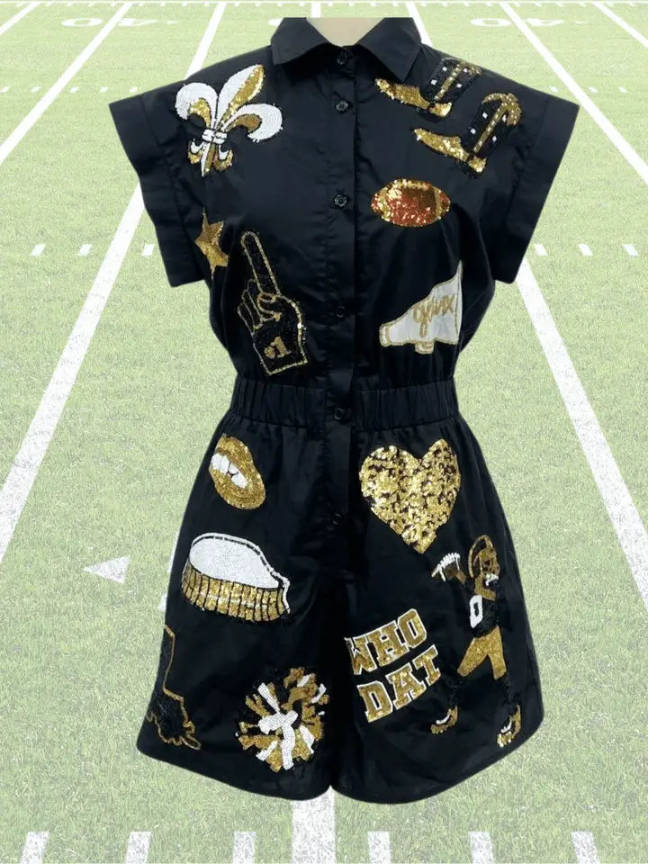 Show your New Orleans Saints pride with the Marchin' In Romper in bold black and gold. Designed for ultimate comfort and style, this romper lets you celebrate game day with confidence and ease. Its eye-catching colors capture the energy of the Saints while offering a flattering fit perfect for cheering on your team or socializing post-game. Make every Saints celebration unforgettable with this standout gameday essential.