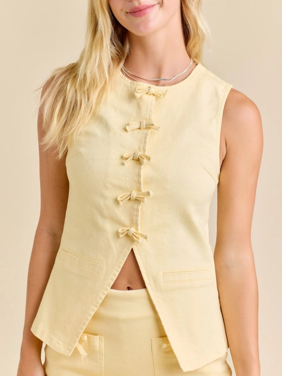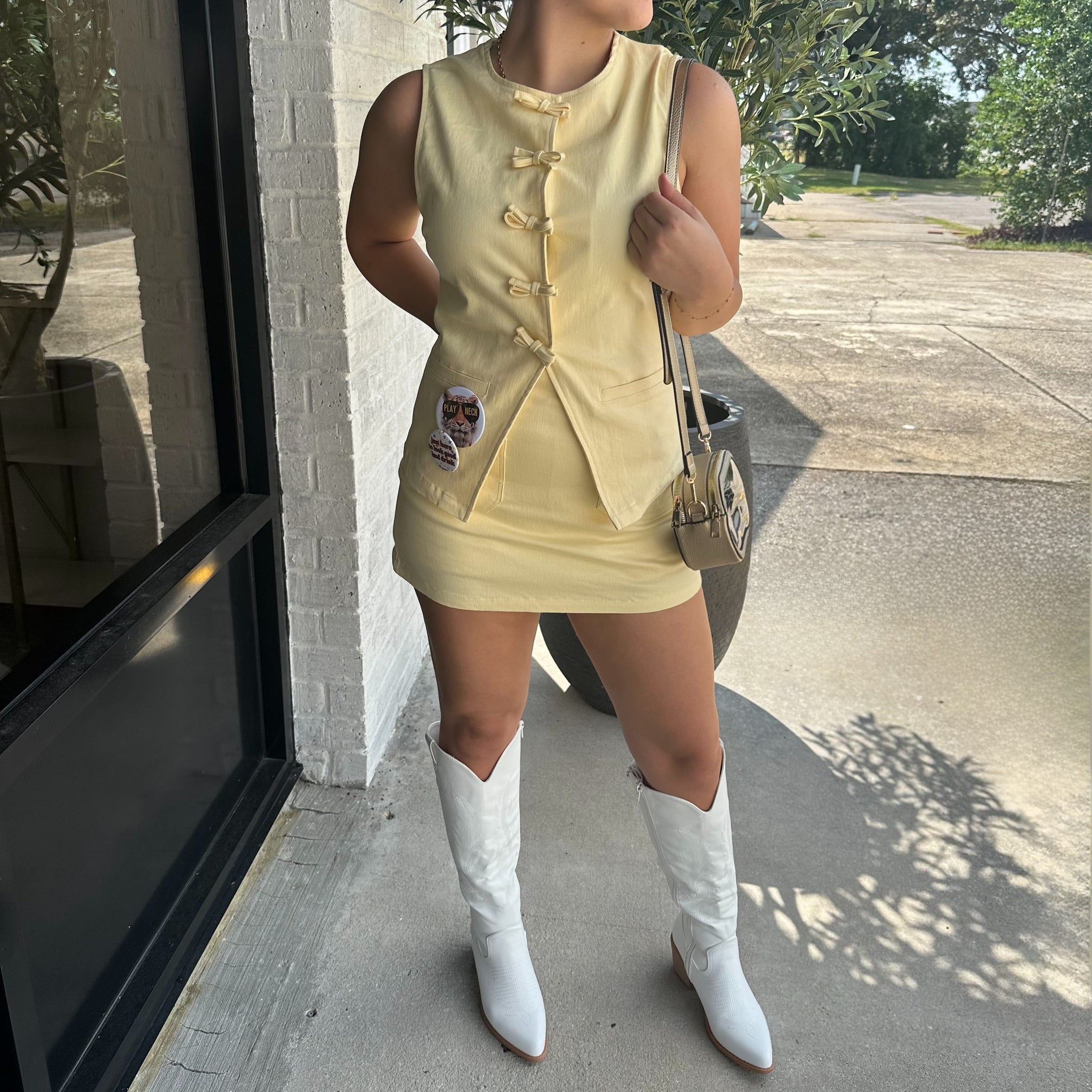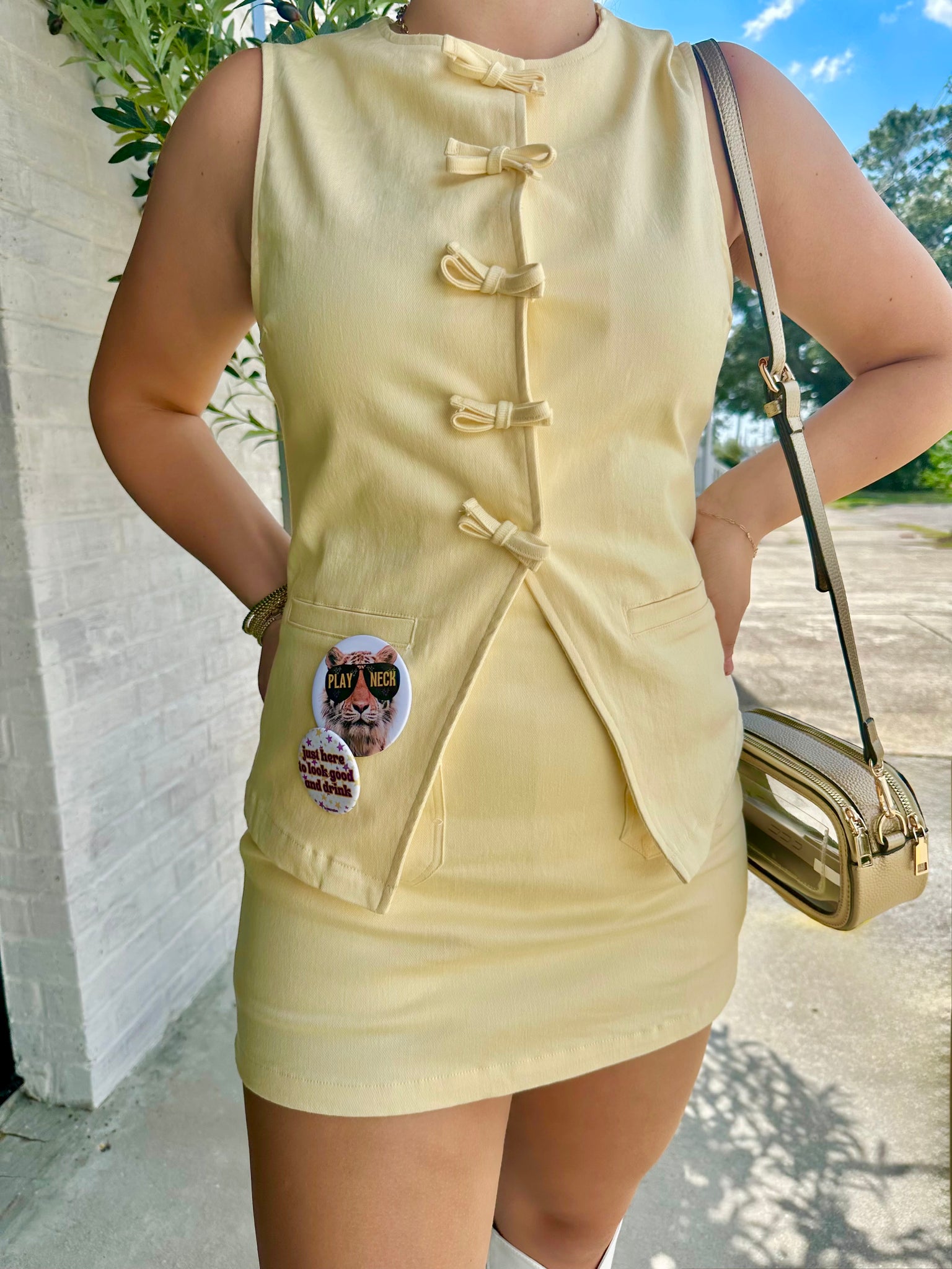 Get ready for game day with the Geaux Gold Set, designed to keep you stylish and comfortable while showing your LSU pride. This sleeveless vest features a chic front bow knot detail, perfectly paired with a mini skort that includes a trendy front tie and a convenient back zipper. Ideal for tailgates and spirited celebrations, this set combines sporty charm with feminine flair to help you stand out in the crowd. Embrace the spirit and make a statement in this must-have LSU gameday outfit.