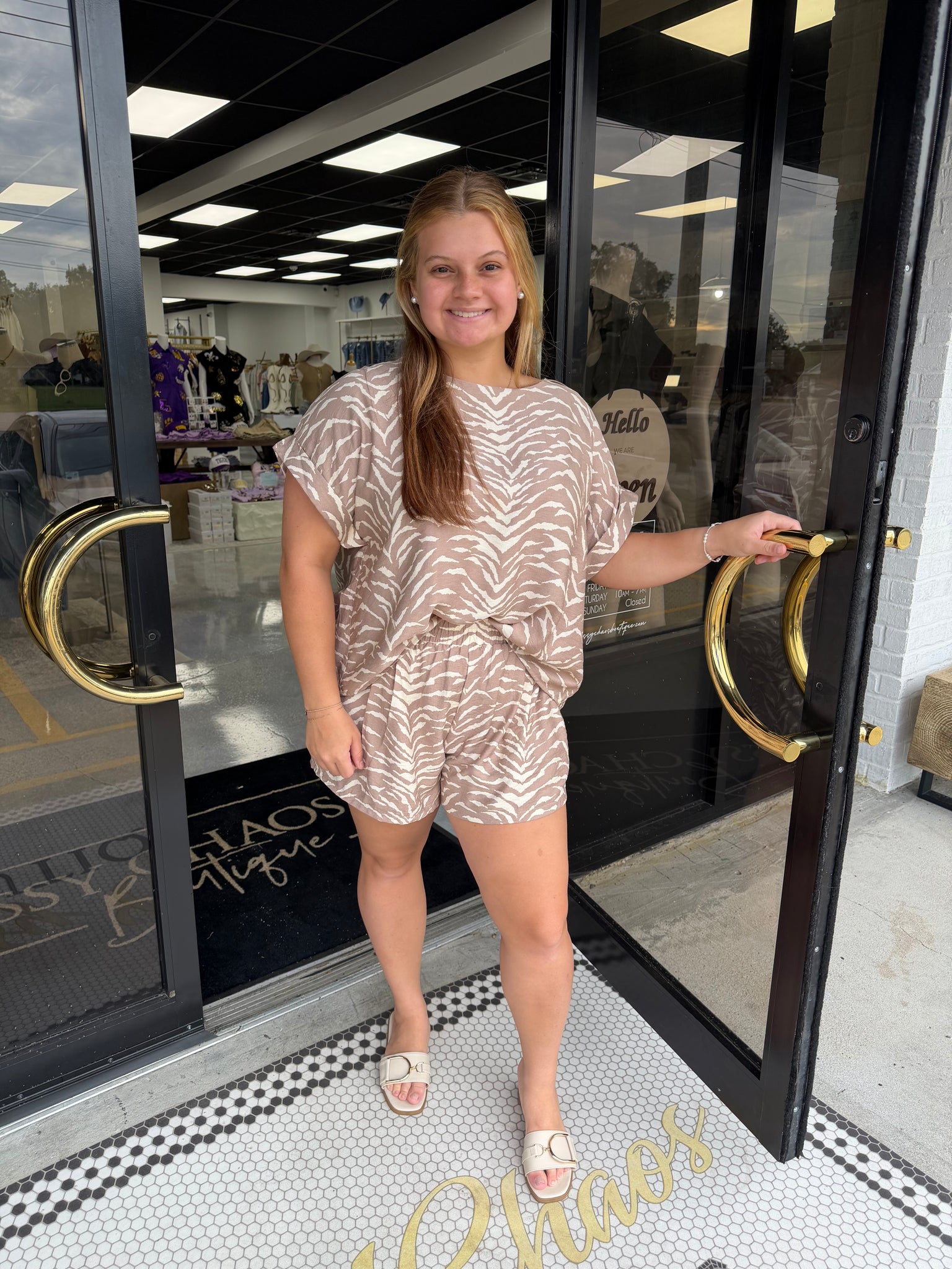 Experience effortless style with the Vanessa Animal Print Set, featuring a relaxed short-sleeve top and matching shorts. This coordinated duo offers breathable comfort and a flattering fit, perfect for casual outings or lounging at home. The bold animal print adds a chic edge, making it easy to stand out while staying comfortable all day long. Elevate your wardrobe with this versatile set designed to keep you stylish and relaxed wherever you go.