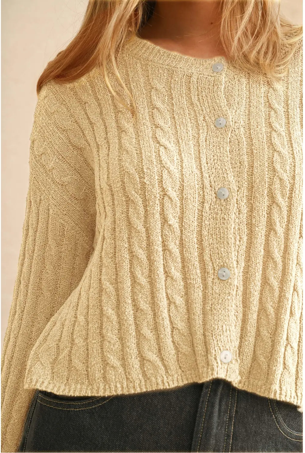 Effortlessly layer with our Breezy Days Cable Knit Cardigan—a lightweight essential that moves with you. The classic cable knit texture adds visual interest and dimension, while the airy construction keeps you comfortable from morning to night. Perfect for transitional seasons, this versatile piece pairs beautifully with everything from casual tees to dresses. Slip it on for instant polish without the bulk. A wardrobe staple that delivers timeless style and everyday wearability.