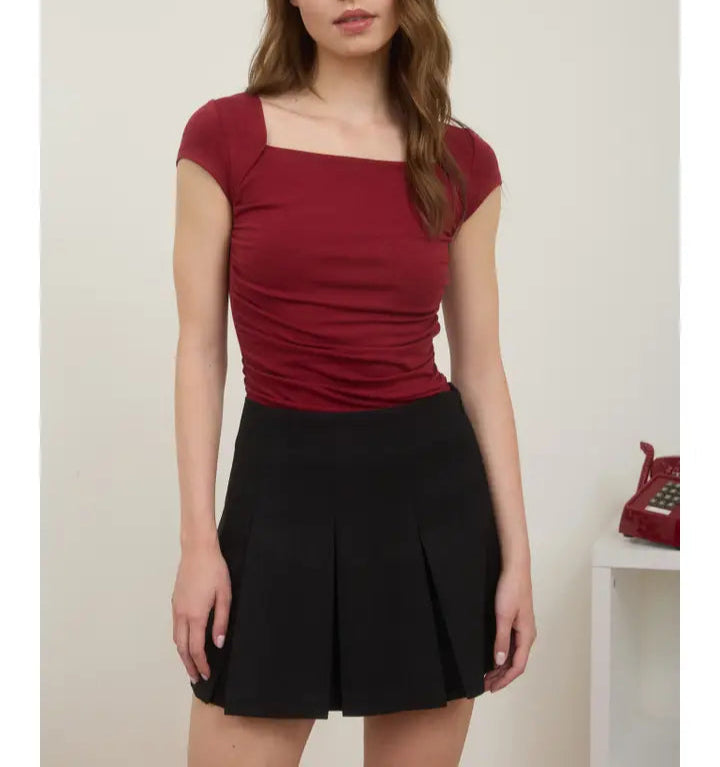 Elevate your wardrobe with the Blythe Knit Top, featuring a flattering square neckline and delicate ruched detailing. Its short sleeves and soft knit fabric offer comfort and style, making it perfect for both casual outings and chic layering. Embrace effortless elegance with this versatile top designed to enhance your everyday look.