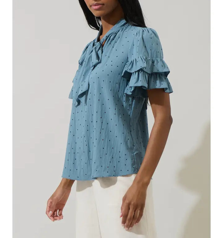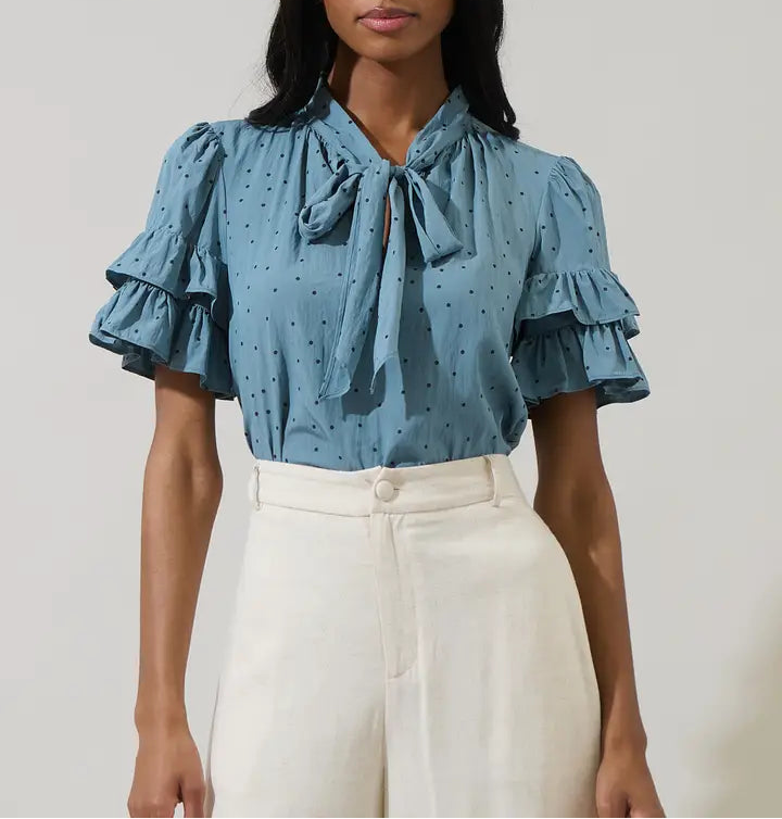 Elevate your wardrobe with the Runel Top, featuring a delicate dot pattern and a charming tie neck detail. This blouse effortlessly combines classic femininity with a modern touch, perfect for both office days and casual outings. Lightweight and flattering, it offers all-day comfort while adding a polished finish to any outfit. Transform your look with this versatile piece that pairs beautifully with tailored pants or your favorite jeans.