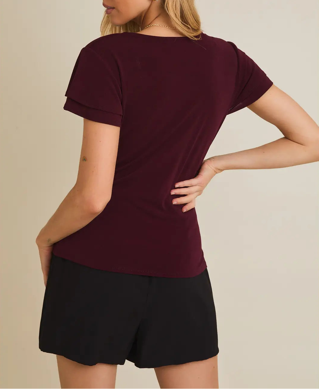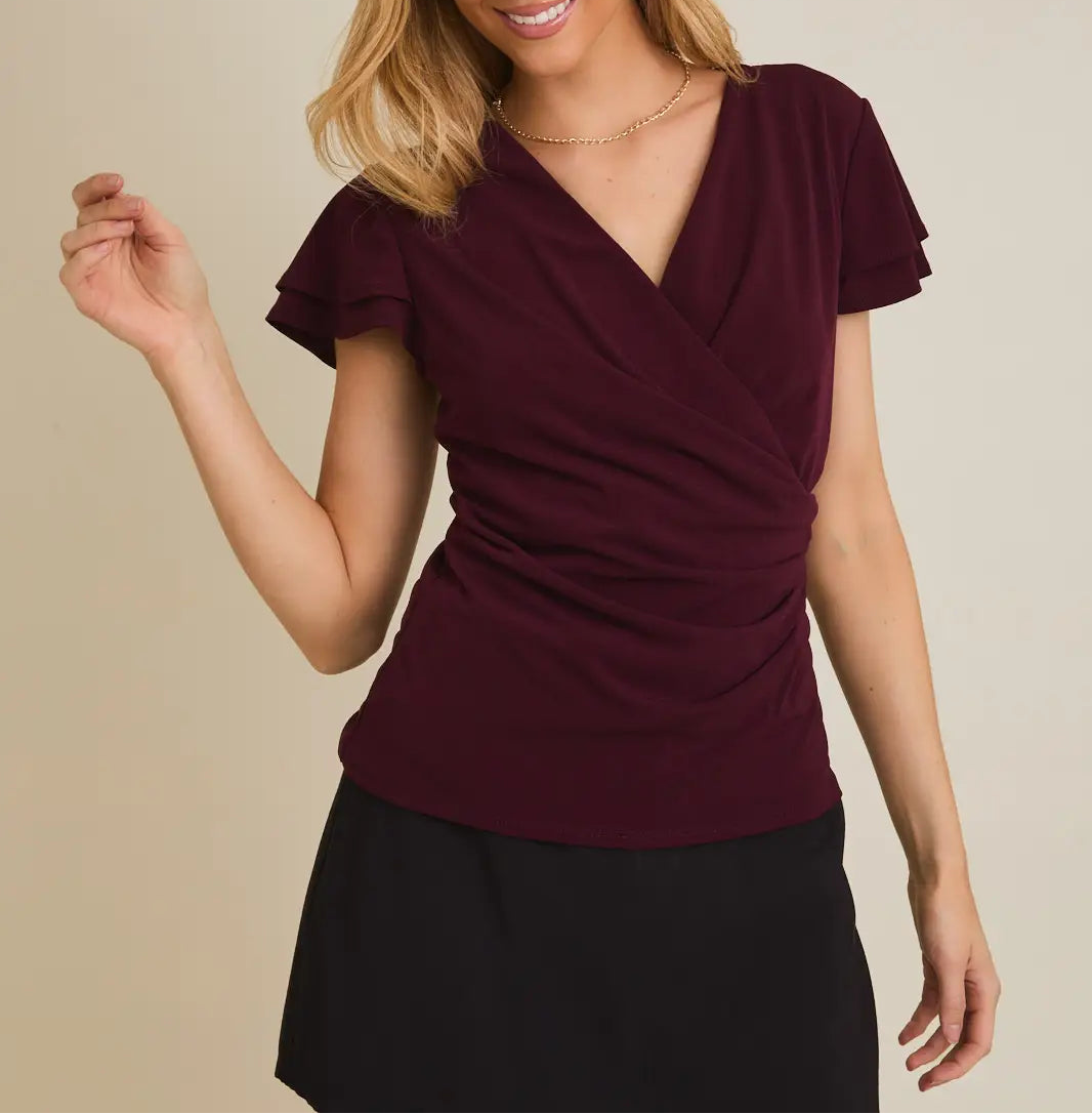 Elevate your everyday wardrobe with the Ivanna Top, a versatile piece that effortlessly blends style and comfort. This flattering V-neck design creates a lengthening silhouette, while delicate ruffles add feminine charm and movement. The shirring detail at the waist provides a subtle shaping effect that flatters every figure. Perfect for layering or wearing solo, this short-sleeve top transitions seamlessly from casual days to dressed-up occasions. Whether you're heading to brunch or the office, the Ivanna Top delivers polished sophistication with an approachable, modern edge.