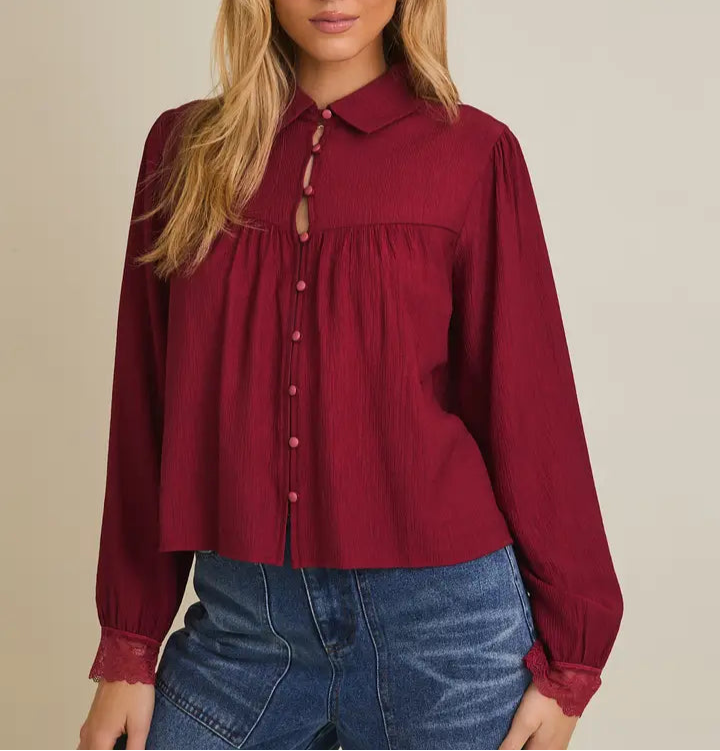 Elevate your wardrobe with the Alanna Top, a sophisticated button-up shirt featuring delicate lace trim along the sleeves and collar. Its long sleeves offer a polished look perfect for both office meetings and evening outings. Crafted for comfort and style, this shirt seamlessly blends classic design with feminine details, making it an essential versatile piece that enhances your everyday elegance.