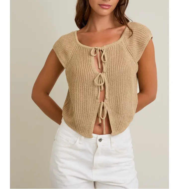 Elevate your wardrobe with the Jenna Top, a sleeveless sweater cardigan designed for effortless style and comfort. Featuring a chic front tie detail, this versatile piece adds a flattering touch to any outfit. Perfect for layering or wearing on its own, it combines cozy knit fabric with a modern silhouette to keep you looking polished all day long. Make the Jenna Top your go-to choice for a sophisticated yet relaxed look.