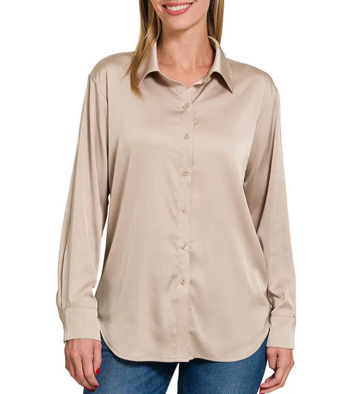 Elevate your wardrobe with the Harmony Satin Button Top. Crafted from smooth satin charmeuse, this shirt offers a luxurious sheen and silky feel that moves effortlessly with you. The classic button front adds timeless style, making it perfect for both polished workdays and elegant evenings. Experience comfort and sophistication in one versatile piece designed to enhance your look with subtle shine and refined charm.