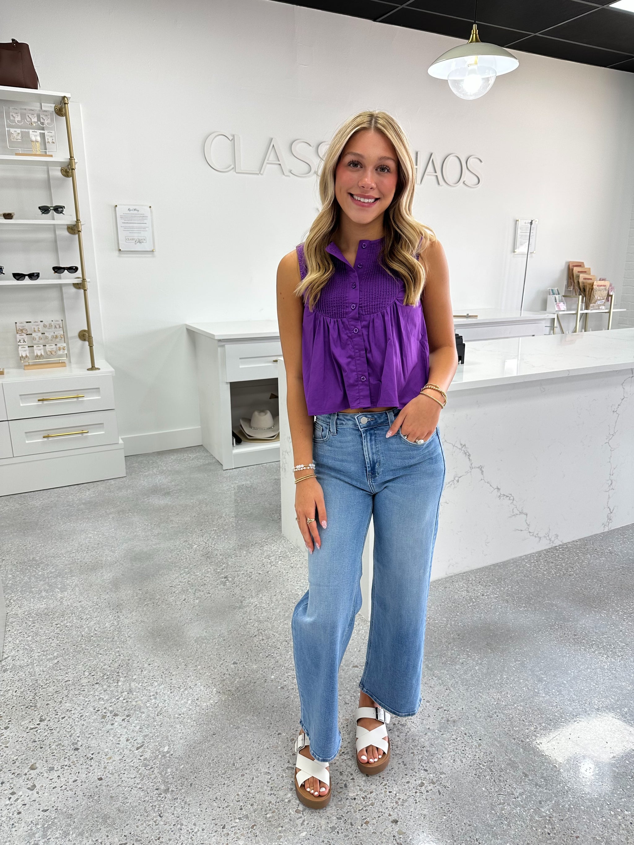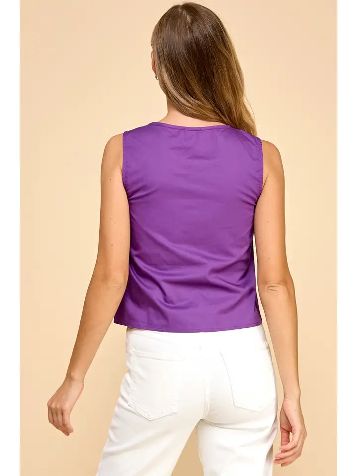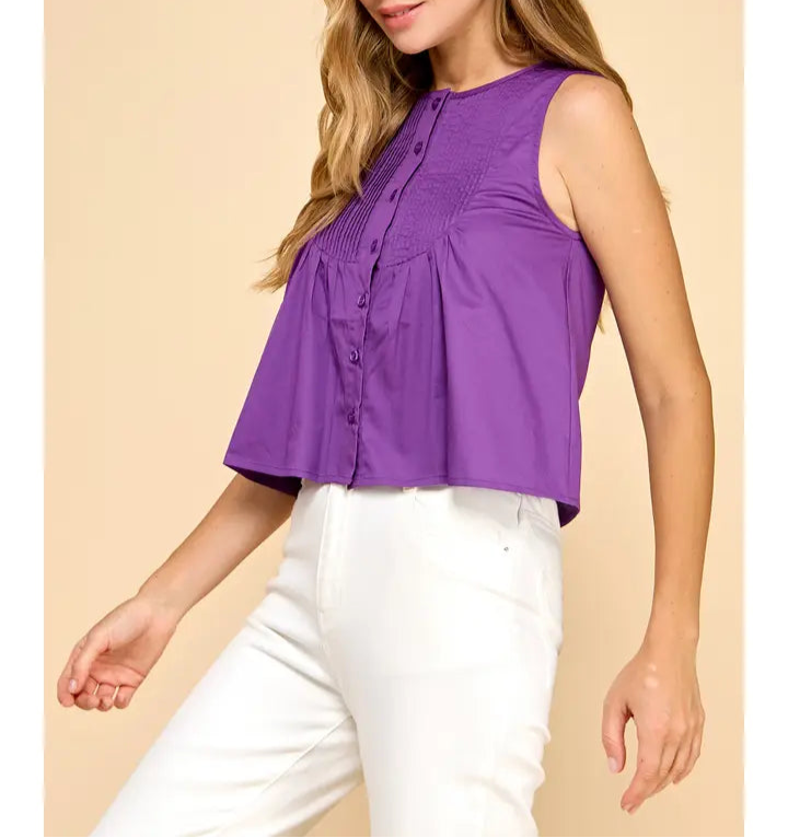 Elevate your wardrobe with the Makenzie Top, featuring a sophisticated pleated chest design and a sleek button-down front. This sleeveless style offers a perfect blend of elegance and comfort, making it ideal for both professional settings and casual outings. Its tailored fit enhances your silhouette while keeping you cool and stylish all day long. Add a touch of refined charm to any outfit with this versatile top.