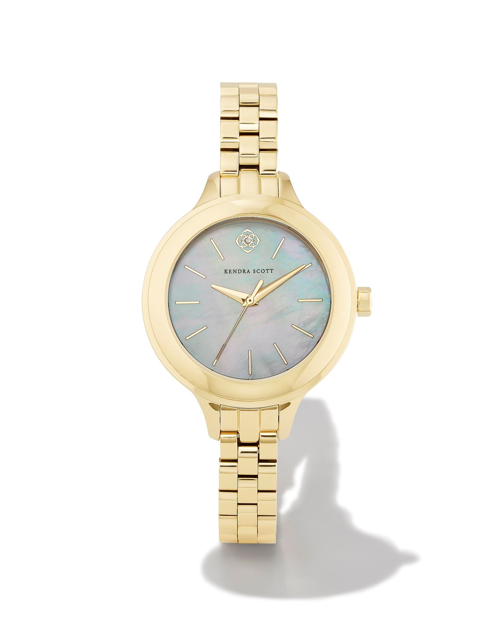Designed in the most polished of metals and with a sapphire glass case, the Alex Gold Tone Stainless Steel 35mm Narrow Watch Band in Ivory Mother-of-Pearl is one you never have to take off. A minimal take on the fan-favorite Alex Watch Band, this elevated timepiece features a shimmering mother-of-pearl face complete with our iconic medallion logo.