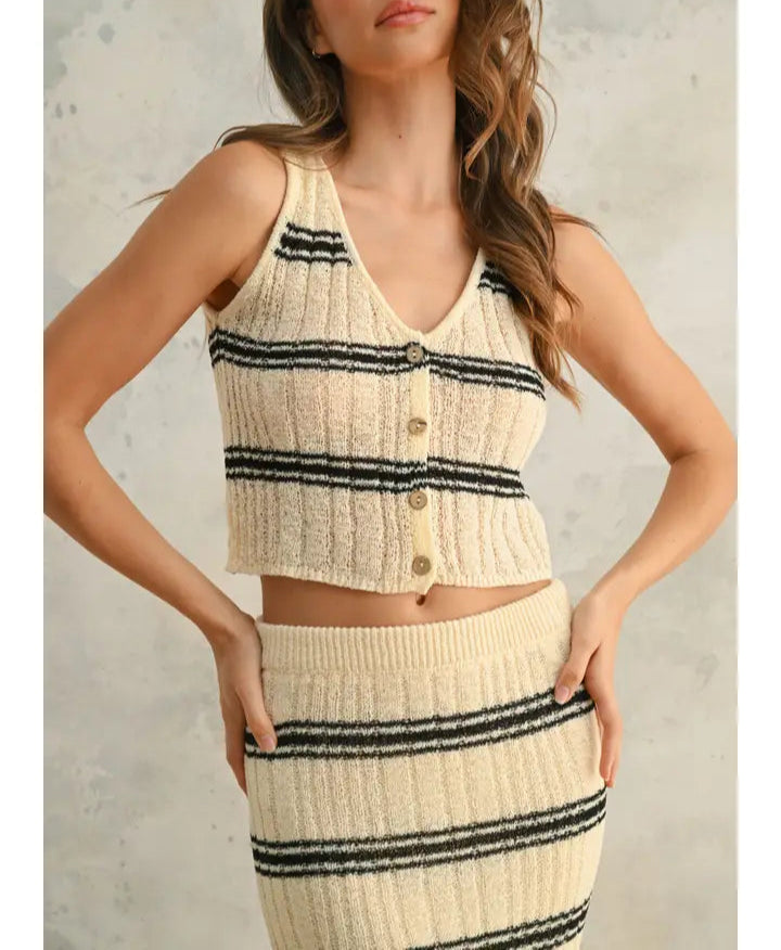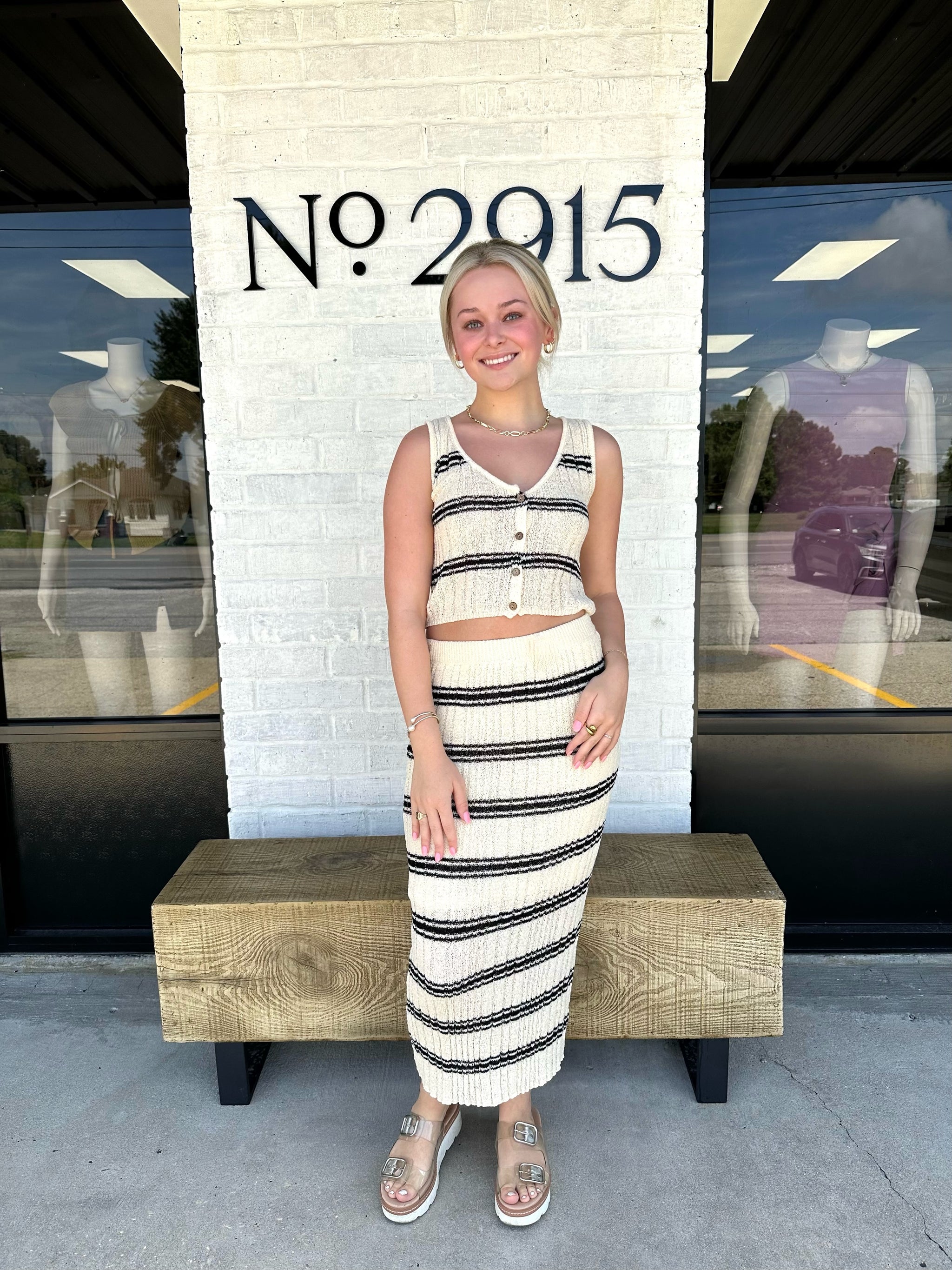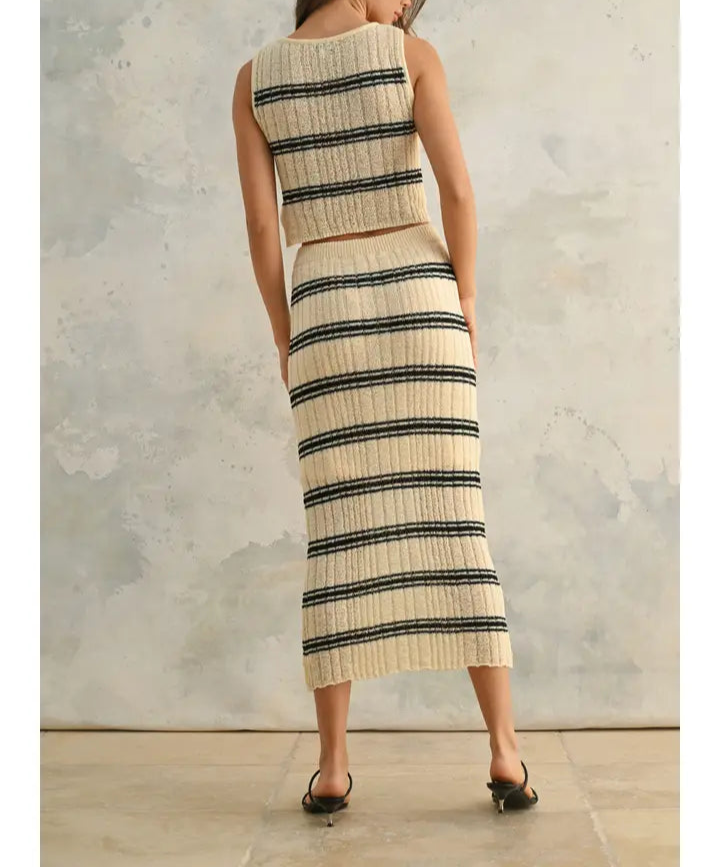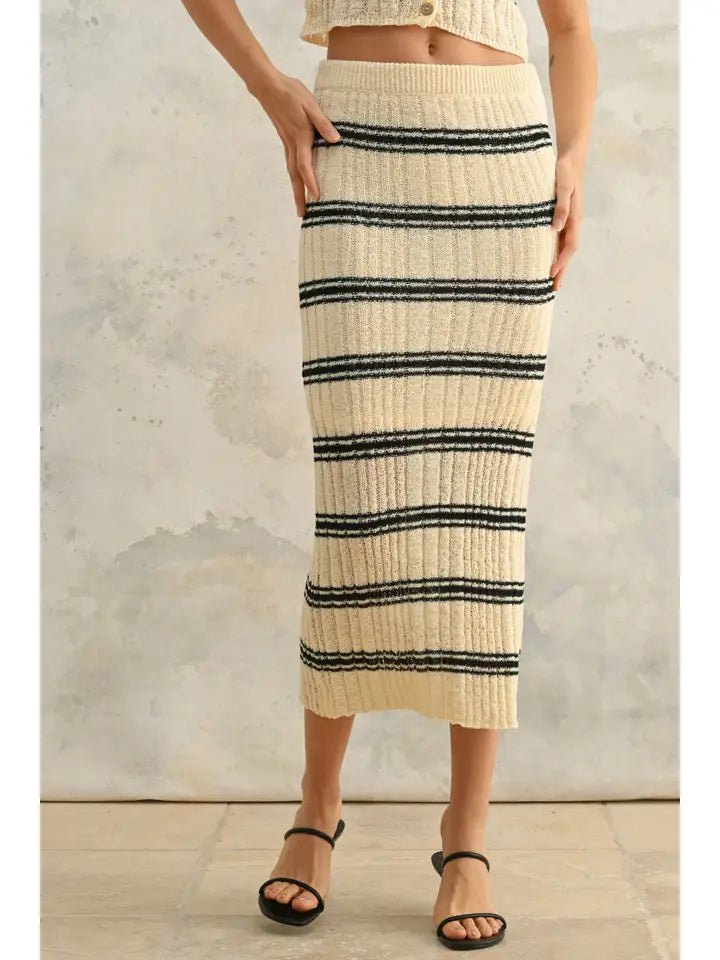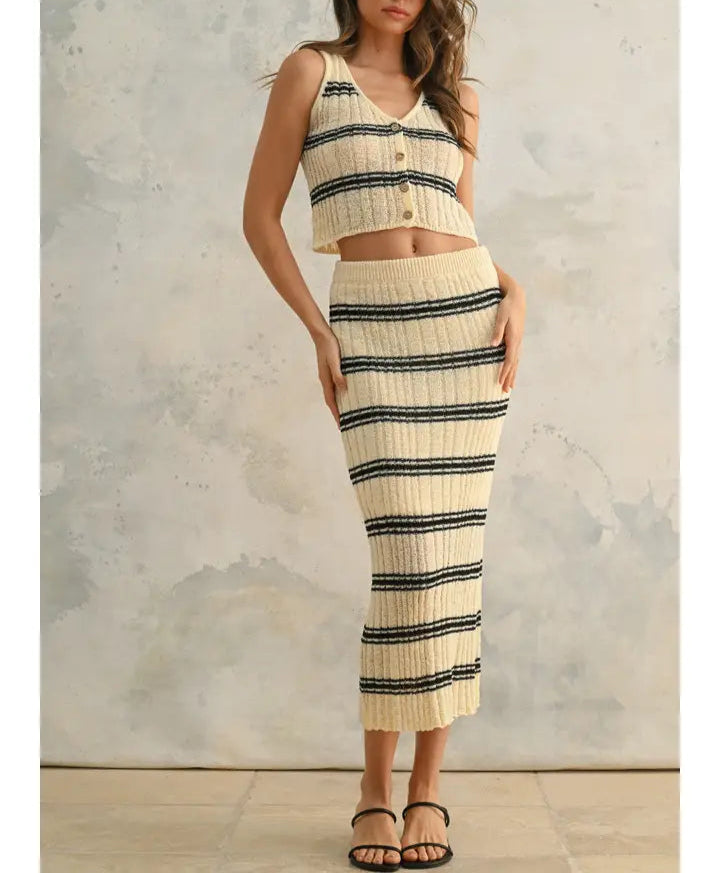 Elevate your wardrobe with the Chelly Set, featuring a striped knitted skirt paired with a button-down knitted top. This coordinated set offers a stylish stripe pattern that effortlessly blends comfort and chic appeal. Perfect for casual outings or relaxed office days, it provides a flattering fit while keeping you cozy. Embrace versatile fashion that makes dressing up simple and sophisticated.